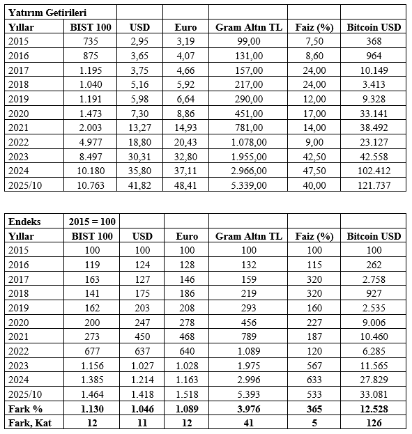 Aşağıdaki tablolardan üstteki 2015 yılından bugüne kadar BIST 100 endeksi, dolar (USD), Euro, gram altın (TL), mevduat faizi (TL) ve kripto paraları temsilen Bitcoin’in (USD olarak) geçirdiği gelişmeleri gösteriyor. Alttaki tablo 2015 yılını bütün bu araçlar için 100 kabul ederek oluşturduğumuz endekse göre yıllar içinde aldıkları değerleri ortaya koyuyor (üstteki tablo; BIST, Bloomberg HT, Paratic Piyasalar, CNBCe, trading view sitelerindeki veriler kullanılarak tarafımdan hazırlanmış, alttaki tablo 2015 yılı 100 kabul edilmek suretiyle üstteki tablonun verileri endekslenerek oluşturulmuştur):