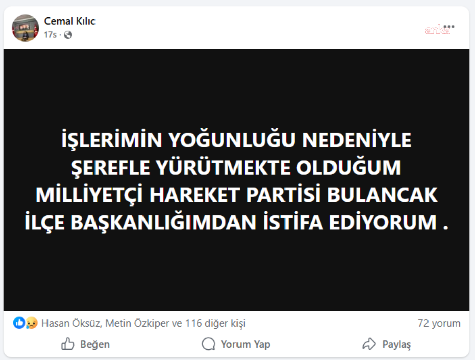 “İşlerimin yoğunluğu nedeniyle şerefle yürütmekte olduğum Milliyetçi Hareket Partisi Bulancak İlçe Başkanlığımdan istifa ediyorum .”