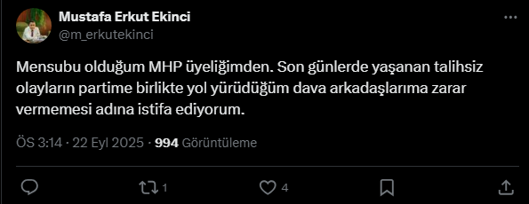 “Mensubu olduğum MHP üyeliğimden. Son günlerde yaşanan talihsiz olayların partime birlikte yol yürüdüğüm dava arkadaşlarıma zarar vermemesi adına istifa ediyorum.”